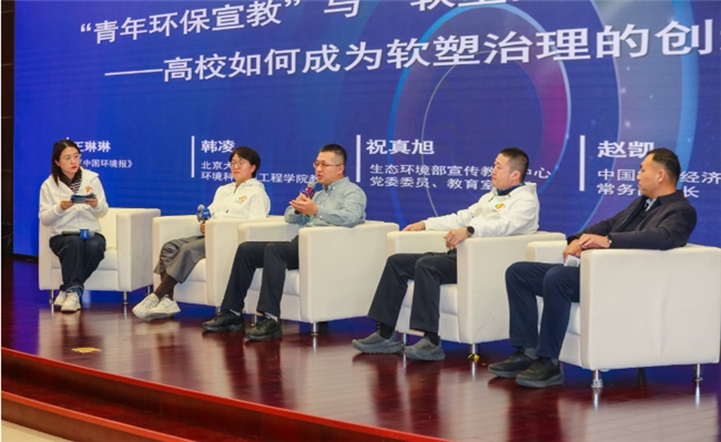 总结会现场还组织了两场专题讨论。第一场专题讨论以“软塑治理的系统路径:从认知到产业的闭环”为主题,学界、政府和行业代表深入探讨了如何打通软塑回收的全链条。生态环境部宣传教育中心党委委员、教育室主任祝真旭认为,要从宣教的层面提高青年环保素养,通过课程、调查、品牌活动等多种方式调动青年共同参与软塑的科普传播;中国物资再生协会再生塑料分会副秘书长周云飞从产业角度指出,软塑回收的关键在于“前后端协同”,他特别强调,高校作为高认知度群体,完全可以实现软塑回收,但必须将其回收体系与社会大循环衔接,才能形成可持续的产业闭环;中国循环经济协会常务副会长赵凯分享了政策层面的最新动向,指出建立中国自己的再生材料标准与认证体系是未来的关键。
